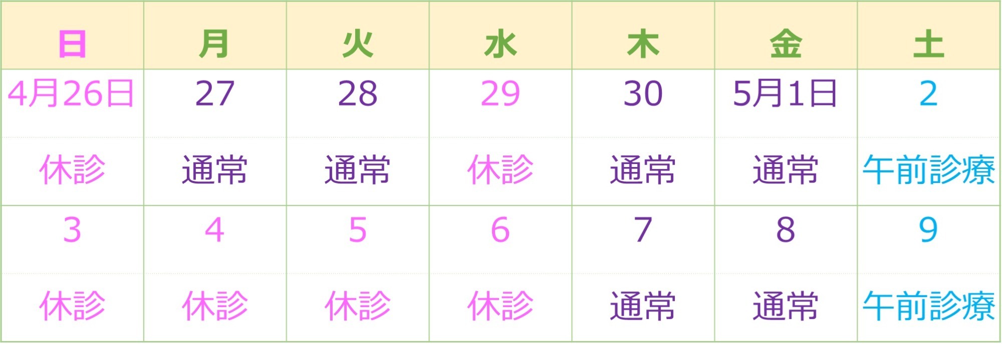 | 午後 | ○ | ○ | 休 | ○ | ○ | 休 |
